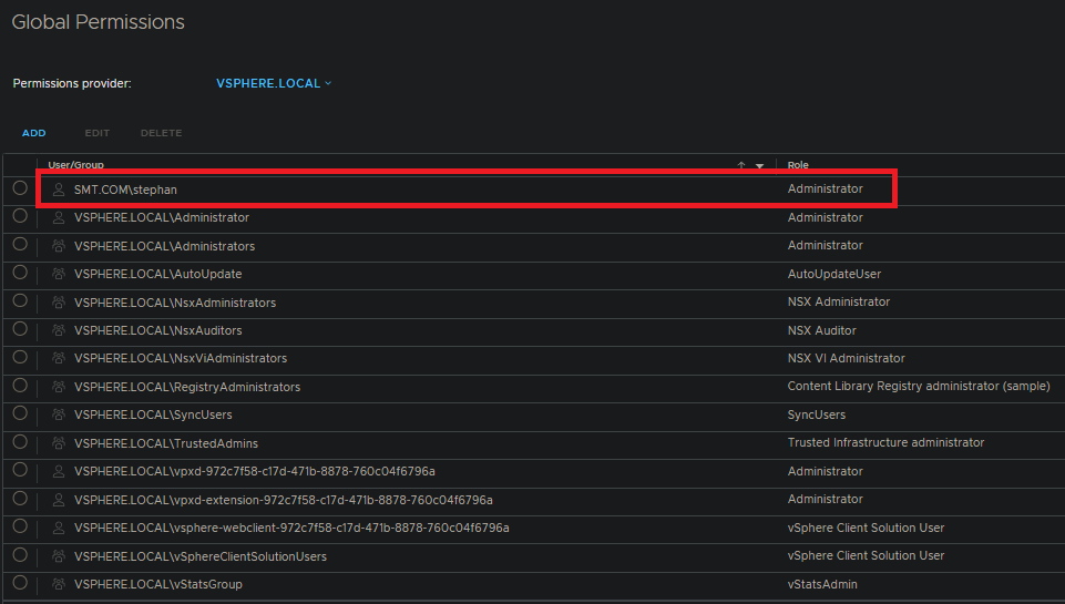 5{"principal":{"name":"VSPHERE.LOCAL\\NsxAuditors","group":true},"roles":[741131114],"propagate":true},{"principal":{"name":"VSPHERE.LOCAL\\NsxViAdministrators","group":true},"roles":[-2094871953],"propagate":true},{"principal":{"name":"VSPHERE.LOCAL\\NsxAdministrators","group":true},"roles":[-1723127349],"propagate":true},{"principal":{"name":"VSPHERE.LOCAL\\RegistryAdministrators","group":true},"roles":[1006],"propagate":true},{"principal":{"name":"SMT.COM\\stephan","group":false},"roles":[-1],"propagate":true},{"principal":{"name":"VSPHERE.LOCAL\\vStatsGroup","group":true},"roles":[-292639496],"propagate":true}]},"name":"AuthManagement"},"ApplianceManagement":{"description":"Appliance Mangment Service","action":"RESTART\_SERVICE","actionOn":{"VC\_SERVICES":\["applmgmt"\],"SYSTEMD":\["sendmail","rsyslog"]},"version":"7.0","config":{"/etc/applmgmt/appliance/appliance.conf":{"Is shell Enabled":false,"Shell Expiration Time":null,"TimeSync Mode (Host/NTP)":"NTP"},"/etc/sysconfig/clock":{"Time zone":""Europe/London"","UTC":"1"},"/usr/bin/systemctl/sshd.service":{"Enable SSH":"true"},"/etc/ntp.conf":{"Time servers":["uk.pool.ntp.org"]},"/etc/mail/sendmail.cf":{"SMTP Port":null,"Mail server":null},"/etc/vmware-syslog/syslog.conf":{"Port [2]":null,"Port [1]":null,"Port [0]":null,"Protocol [2]":null,"Remote Syslog Host [1]":null,"Protocol [1]":null,"Remote Syslog Host [0]":null,"Protocol \[0\]":null,"Remote Syslog Host [2]":null},"/etc/pam.d/system-auth":{"Deny Login after these many Unsuccessful Attempts.":"3","Unlock root after (seconds)":"300","On Error Login will be.":"fail","Include Root user for SSH lockout.":true,"Unlock user after (seconds)":"900"},"/etc/shadow":{"root":{"maximumDays":"","warningDays":"7"},"bin":{"maximumDays":"90","warningDays":"7"},"daemon":{"maximumDays":"90","warningDays":"7"},"messagebus":{"maximumDays":"90","warningDays":"7"},"systemd-bus-proxy":{"maximumDays":"90","warningDays":"7"},"systemd-journal-gateway":{"maximumDays":"90","warningDays":"7"},"systemd-journal-remote":{"maximumDays":"90","warningDays":"7"},"systemd-journal-upload":{"maximumDays":"90","warningDays":"7"},"systemd-network":{"maximumDays":"90","warningDays":"7"},"systemd-resolve":{"maximumDays":"90","warningDays":"7"},"systemd-timesync":{"maximumDays":"90","warningDays":"7"},"nobody":{"maximumDays":"90","warningDays":"7"},"rpc":{"maximumDays":"90","warningDays":"7"},"ntp":{"maximumDays":"90","warningDays":"7"},"sshd":{"maximumDays":"90","warningDays":"7"},"smmsp":{"maximumDays":"90","warningDays":"7"},"apache":{"maximumDays":"90","warningDays":"7"},"sso-user":{"maximumDays":"90","warningDays":"7"},"vpostgres":{"maximumDays":"","warningDays":"7"},"vapiEndpoint":{"maximumDays":"90","warningDays":"7"},"eam":{"maximumDays":"90","warningDays":"7"},"vlcm":{"maximumDays":"90","warningDays":"7"},"vsan-health":{"maximumDays":"90","warningDays":"7"},"vsm":{"maximumDays":"90","warningDays":"7"},"vsphere-ui":{"maximumDays":"90","warningDays":"7"},"wcp":{"maximumDays":"","warningDays":"7"},"content-library":{"maximumDays":"90","warningDays":"7"},"imagebuilder":{"maximumDays":"90","warningDays":"7"},"perfcharts":{"maximumDays":"90","warningDays":"7"},"vpgmonusr":{"maximumDays":"","warningDays":"7"},"vtsdbmonusr":{"maximumDays":"","warningDays":"7"},"Send Waring before this No of Days.":null,"Password validity (days)":null}},"name":"ApplianceManagement"}}}