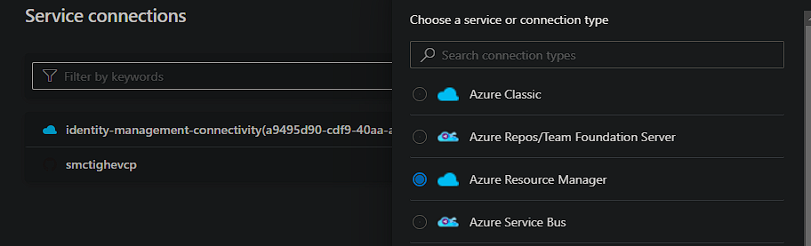 When selecting new, choose the Azure Resource Manager type, followed by Service principal (automatic).