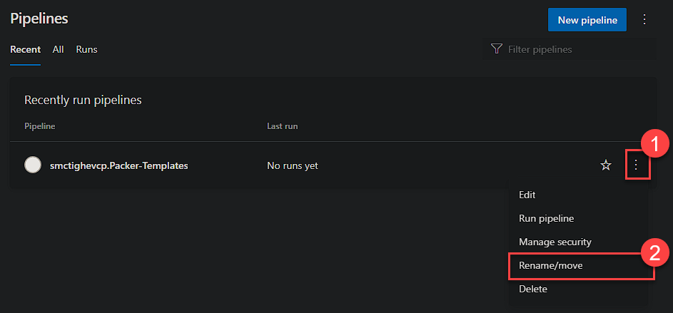 We want to rename the actual Pipeline to the template name. Head back to the Pipelines menu, click the 3 dots and select ‘Rename/Move’. Give it the same name as your YAML file for consistency.
