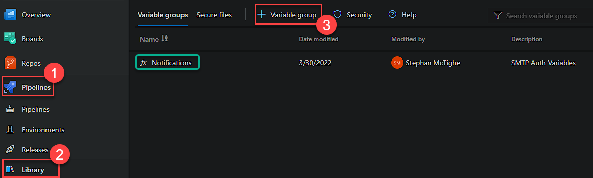 You can set these by heading to Pipelines > Library and then clicking ‘+ Variable group’. You can see my group called ‘Notifications’ already created.