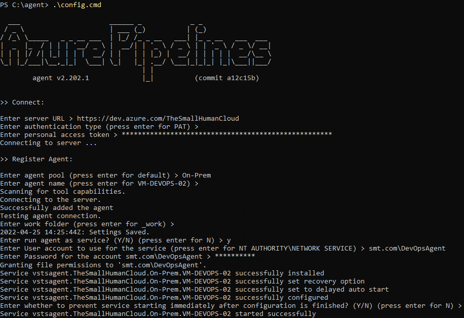 You will need your DevOps Organisation URL, PAT Token and an AD (Active Directory) account to run the Agent service under. As mentioned, you can use the NETWORK SERVICE if you wish.