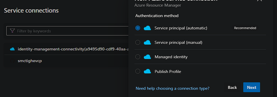 When selecting new, choose the Azure Resource Manager type, followed by Service principal (automatic).
