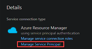 Now head over to Azure to match the name of the Service Principal in Azure with the Service Connection from DevOps. To do this select the Service Connection, and then Manage: