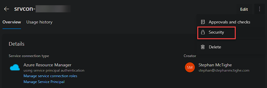 Now back over to the DevOps portal, we can give permissions to each template pipeline to use this service connection. First, click on security.