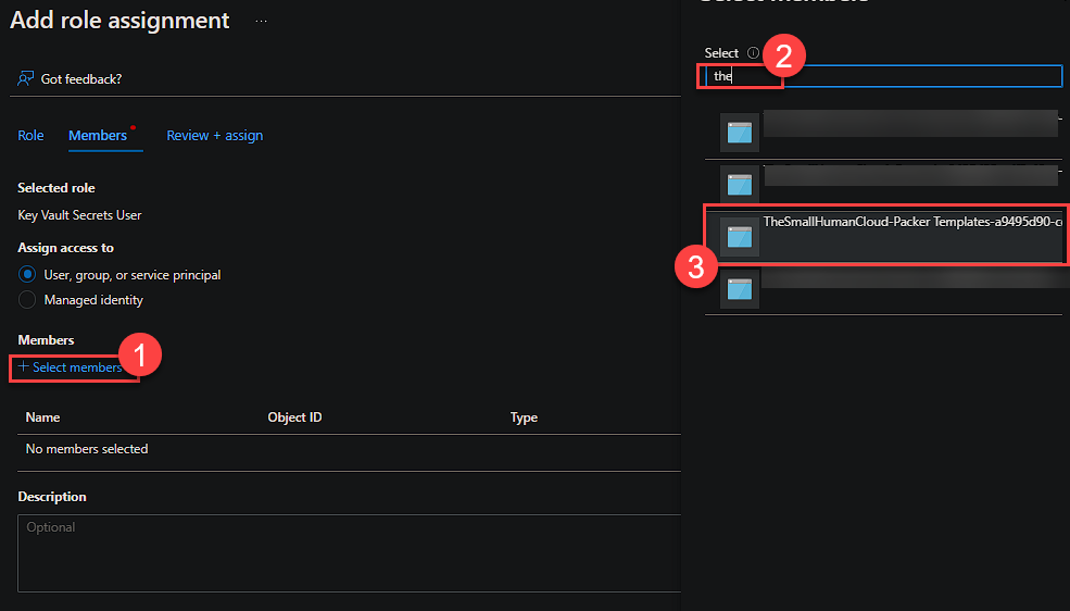 Click’ Select Members’, search for the require service principal and select it, followed by the select option at the bottom.