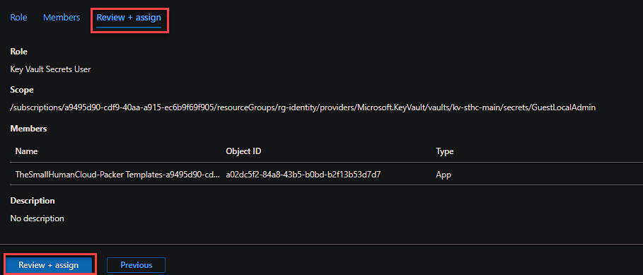 1RoleAssignmentId : /subscriptions/a9495d90-xxxxx-xxxxx-xxxxx-exxxxxxxxxxx/resourcegroups/rg-identity/providers/Microsoft.KeyVault/vaults/kv-vault-name/secrets/GuestLocalAdmin/providers/Microsoft.Authorization/roleAssignments/1b45f2e4-e85a-4723-a4f4-cfd7da11