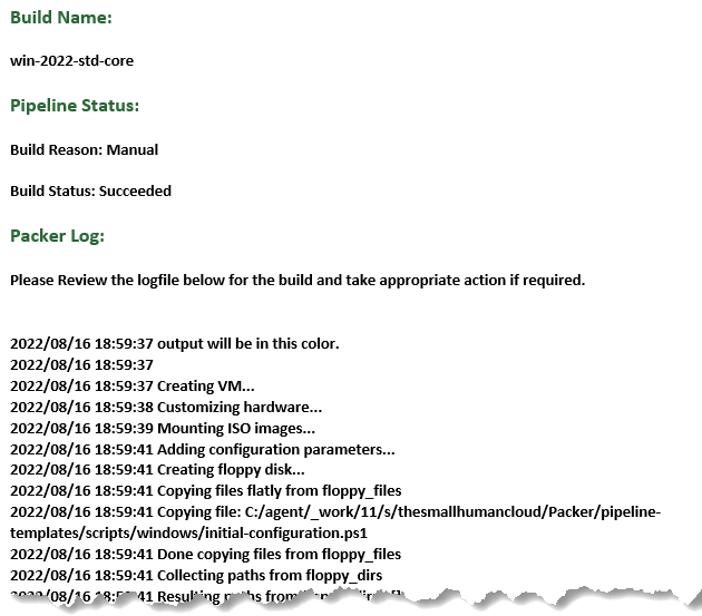 1 $EmailBody = ('<HTML><H1><font color = "#286334"> Notification from The Small Human Cloud - Packer Virtual Machine Templates</font></H1><BODY><p><H3><font color = "#286334">Build Name:</H3></font></p><p><b>$(BuildVersion)</b></p><p><H3><font color = "#286334">Pipeline Status:</H3></font></p><p><b>Build Reason:<b> $(Build.Reason)</p><p><b>Build Status:<b> $(Agent.JobStatus)</p><p><H3><font color = "#286334">Packer Log:</H3></font></p><p>Please Review the logfile below for the build and take appropriate action if required.</p>')+("<p>$EmailContent</p>")