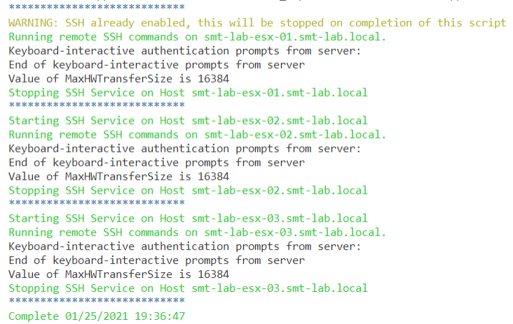 When run, it will then cycle through each of the ESXi hosts from your CSV file, enable SSH (if its not already enabled), accept the host key, run the commands you have specified and finally turn the SSH service off.