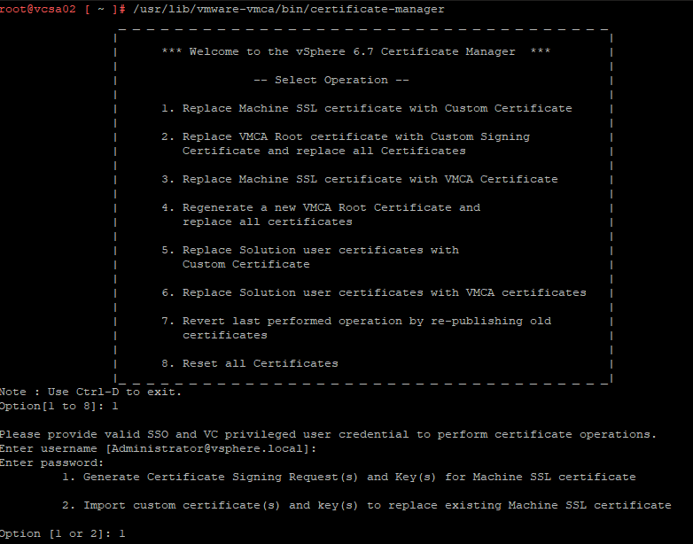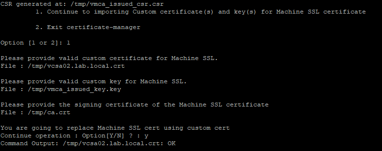 Now back to the Certificate Manager. Selecting option 1 to now import the certifictes. You will be prompted to provide the path and file name of each component. The certificate you created, the .key file that was created during the CSR generation and the root or CA chain certificate. Finally you will be asked to confirm you want to replace the Machine SSL certificate, type y.