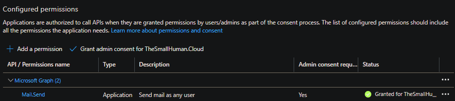 Select Application permissions and scroll down until you see Mail and select the Mail.Send option, and finally click Add permission at the bottom.