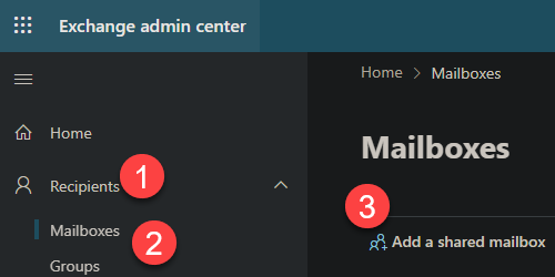 Head over to your Exchange Admin Center and select Recipients, Mailboxes, and select Add a shared mailbox.