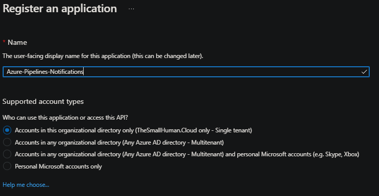 …and provide your application a name. I have also stuck with the default single tenant option.
