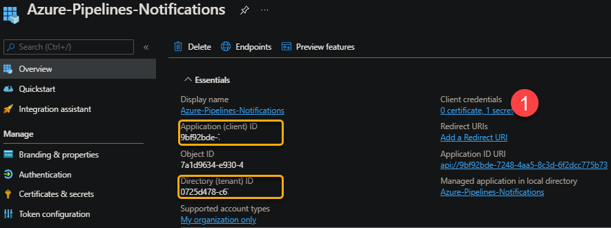 Once created, you will be able to see information that you will need later. Specifically the Application ID and the Tenant ID. You will need a third piece of information, a Secret Key. You can generate one by clicking client credentials.