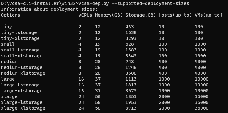vcsa-deploy --supported-deployment-sizes