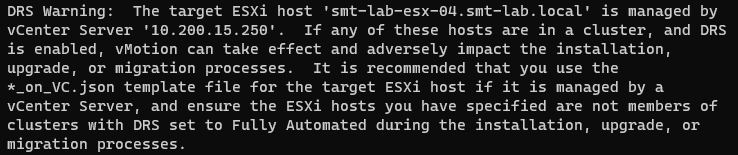 It will also provide warnings if it thinks you might not be using an appropriate template. I originally specified a host what was already managed by vCenter, so it warned me like so: