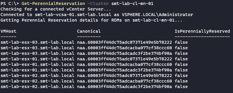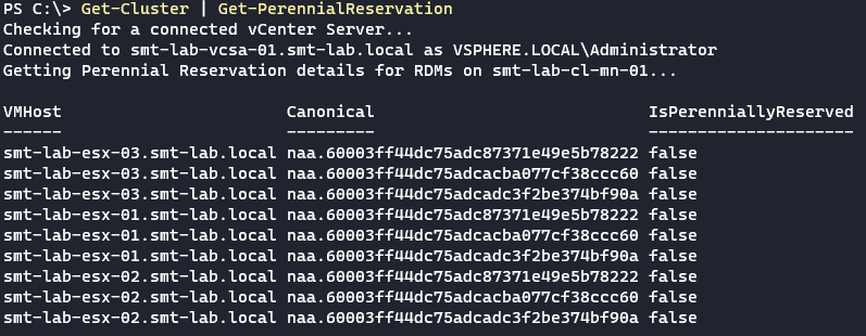 This function targets a vSphere cluster, gets all RDM disks that are connected to VM’s and then queries each host in the cluster to check if the disk/storage device is perennially reserved or not.