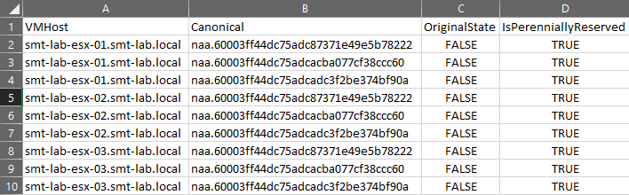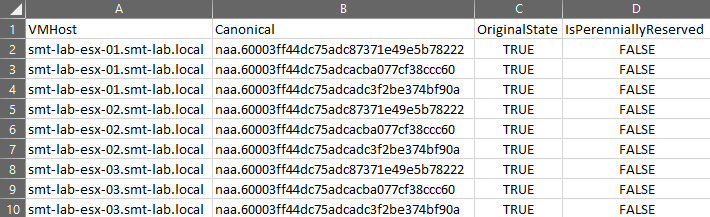 Remove-PerennialReservation -Cluster smt-lab-cl-mn-01 -CanonicalName naa.60003ff44dc75adc87371e49e5b78222, naa.60003ff44dc75adcacba077cf38ccc60, naa.60003ff44dc75adcadc3f2be374bf90a -Exportpath C:\Temp