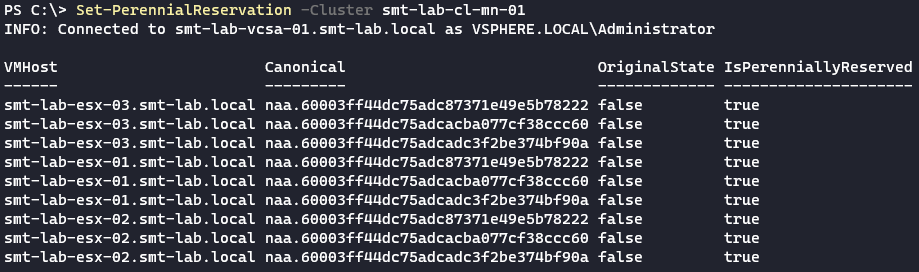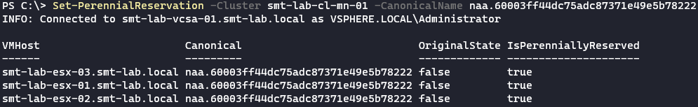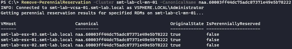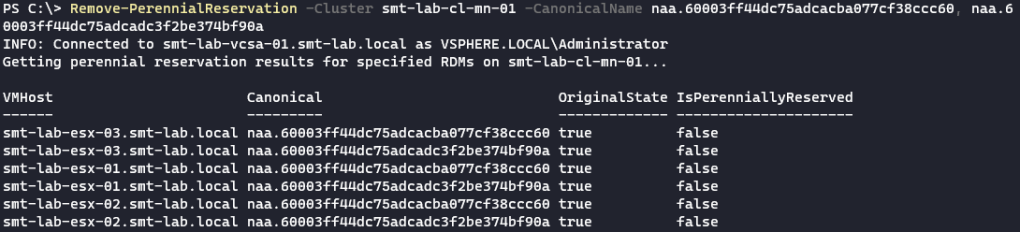 Remove-PerennialReservation -Cluster smt-lab-cl-mn-01 -CanonicalName naa.60003ff44dc75adc87371e49e5b78222