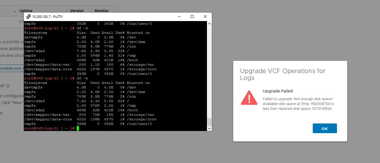 VCF Operations for Logs Upgrade Fails Not Enough Disk Space /tmp