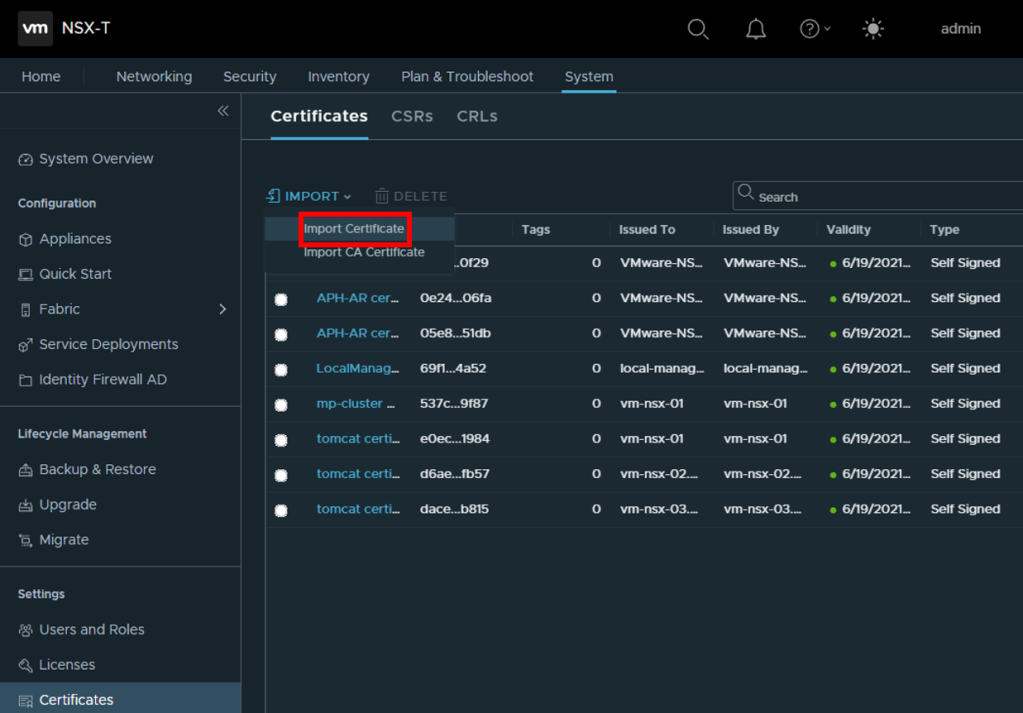 Once I had fired up my NSX Manager Nodes and Cluster (I am using version 3.1), I looked to installing certificates. I choose to use a single certificate for all 3 of the NSX managers and the cluster using Subject Alternative Names (SAN’s) to simplify the process and this means I don’t need to renew 4 certificates each time.