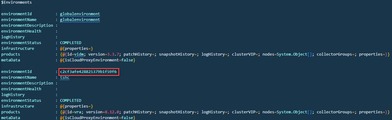 Again we are passing basic authentication credentials and outputting the results into a variable called $Environments. Below we can see and example output and the values we will need later on. You could consume the values from the variable if you wish, but for visibility, I will keep them plain text in this blog.