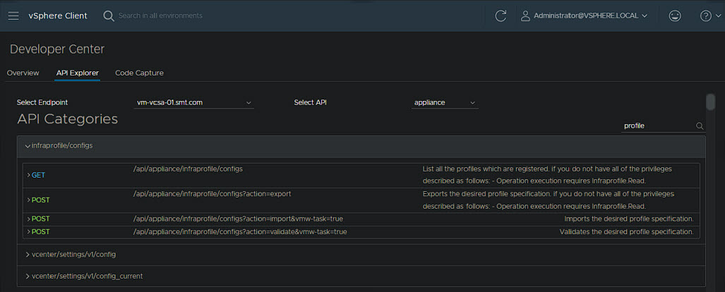 As mentioned earlier, vCenter Server Profiles are currently managed via API’s, not the GUI. They can be found in the Developer Center within vCenter itself as you can see below: