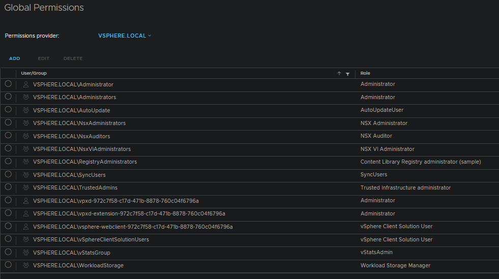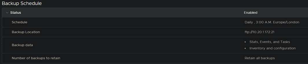 {"principal":{"name":"VSPHERE.LOCAL\\NsxAuditors","group":true},"roles":[741131114],"propagate":true},{"principal":{"name":"VSPHERE.LOCAL\\NsxViAdministrators","group":true},"roles":[-2094871953],"propagate":true},{"principal":{"name":"VSPHERE.LOCAL\\NsxAdministrators","group":true},"roles":[-1723127349],"propagate":true},{"principal":{"name":"VSPHERE.LOCAL\\RegistryAdministrators","group":true},"roles":[1006],"propagate":true},{"principal":{"name":"SMT.COM\\stephan","group":false},"roles":[-1],"propagate":true},{"principal":{"name":"VSPHERE.LOCAL\\vStatsGroup","group":true},"roles":[-292639496],"propagate":true}]},"name":"AuthManagement"},"ApplianceManagement":{"description":"Appliance Mangment Service","action":"RESTART\_SERVICE","actionOn":{"VC\_SERVICES":\["applmgmt"\],"SYSTEMD":\["sendmail","rsyslog"]},"version":"7.0","config":{"/etc/applmgmt/appliance/appliance.conf":{"Is shell Enabled":false,"Shell Expiration Time":null,"TimeSync Mode (Host/NTP)":"NTP"},"/etc/sysconfig/clock":{"Time zone":""Europe/London"","UTC":"1"},"/usr/bin/systemctl/sshd.service":{"Enable SSH":"true"},"/etc/ntp.conf":{"Time servers":["uk.pool.ntp.org"]},"/etc/mail/sendmail.cf":{"SMTP Port":null,"Mail server":null},"/etc/vmware-syslog/syslog.conf":{"Port [2]":null,"Port [1]":null,"Port [0]":null,"Protocol [2]":null,"Remote Syslog Host [1]":null,"Protocol [1]":null,"Remote Syslog Host [0]":null,"Protocol \[0\]":null,"Remote Syslog Host [2]":null},"/etc/pam.d/system-auth":{"Deny Login after these many Unsuccessful Attempts.":"3","Unlock root after (seconds)":"300","On Error Login will be.":"fail","Include Root user for SSH lockout.":true,"Unlock user after (seconds)":"900"},"/etc/shadow":{"root":{"maximumDays":"","warningDays":"7"},"bin":{"maximumDays":"90","warningDays":"7"},"daemon":{"maximumDays":"90","warningDays":"7"},"messagebus":{"maximumDays":"90","warningDays":"7"},"systemd-bus-proxy":{"maximumDays":"90","warningDays":"7"},"systemd-journal-gateway":{"maximumDays":"90","warningDays":"7"},"systemd-journal-remote":{"maximumDays":"90","warningDays":"7"},"systemd-journal-upload":{"maximumDays":"90","warningDays":"7"},"systemd-network":{"maximumDays":"90","warningDays":"7"},"systemd-resolve":{"maximumDays":"90","warningDays":"7"},"systemd-timesync":{"maximumDays":"90","warningDays":"7"},"nobody":{"maximumDays":"90","warningDays":"7"},"rpc":{"maximumDays":"90","warningDays":"7"},"ntp":{"maximumDays":"90","warningDays":"7"},"sshd":{"maximumDays":"90","warningDays":"7"},"smmsp":{"maximumDays":"90","warningDays":"7"},"apache":{"maximumDays":"90","warningDays":"7"},"sso-user":{"maximumDays":"90","warningDays":"7"},"vpostgres":{"maximumDays":"","warningDays":"7"},"vapiEndpoint":{"maximumDays":"90","warningDays":"7"},"eam":{"maximumDays":"90","warningDays":"7"},"vlcm":{"maximumDays":"90","warningDays":"7"},"vsan-health":{"maximumDays":"90","warningDays":"7"},"vsm":{"maximumDays":"90","warningDays":"7"},"vsphere-ui":{"maximumDays":"90","warningDays":"7"},"wcp":{"maximumDays":"","warningDays":"7"},"content-library":{"maximumDays":"90","warningDays":"7"},"imagebuilder":{"maximumDays":"90","warningDays":"7"},"perfcharts":{"maximumDays":"90","warningDays":"7"},"vpgmonusr":{"maximumDays":"","warningDays":"7"},"vtsdbmonusr":{"maximumDays":"","warningDays":"7"},"Send Waring before this No of Days.":null,"Password validity (days)":null}},"name":"ApplianceManagement"}}}