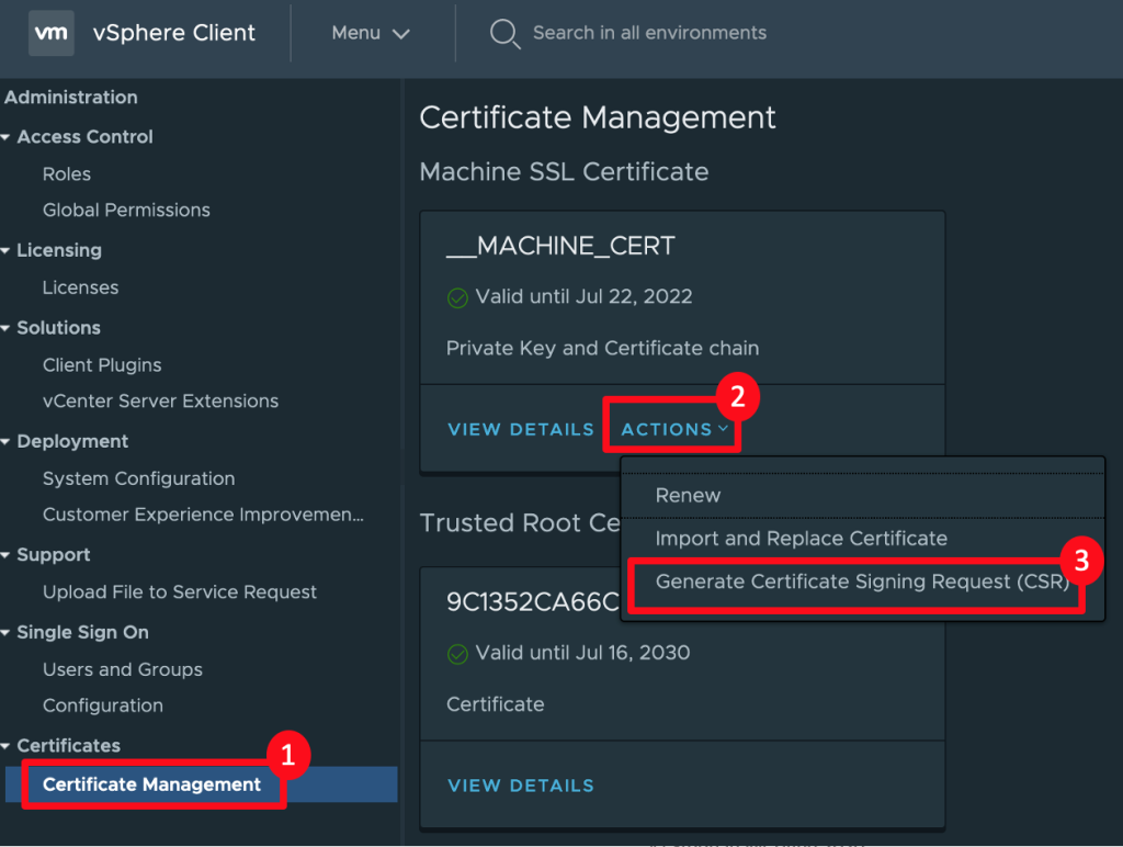 Firstly, in your vSphere Client, browse to Administration > Certificates. Then click Actions and select ‘Generate Certificate Signing Request (CSR)’.
