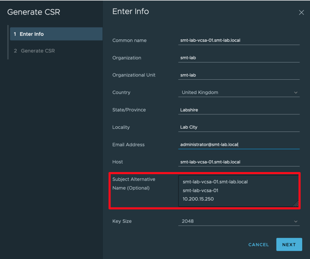 Complete the required fields with your information, making sure you have at least added the common name as a Subject Alternative Name to avoid issues with modern browsers. Click Next.