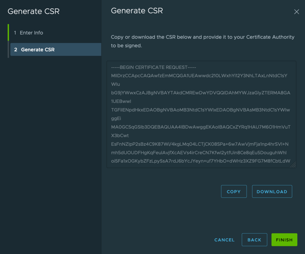 Finally, copy or download your CSR to generate the certificate on the CA of your choosing. Click Finish when ready.