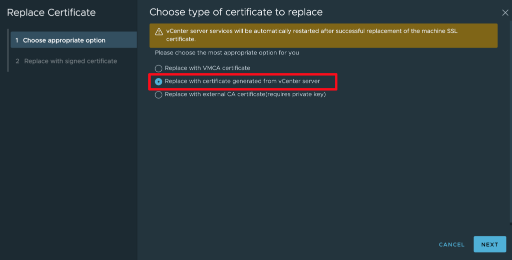 You then need to select the second option. This may seem slightly deceiving but it effectively is the option you need when you have generated the CSR from vCenter like this.